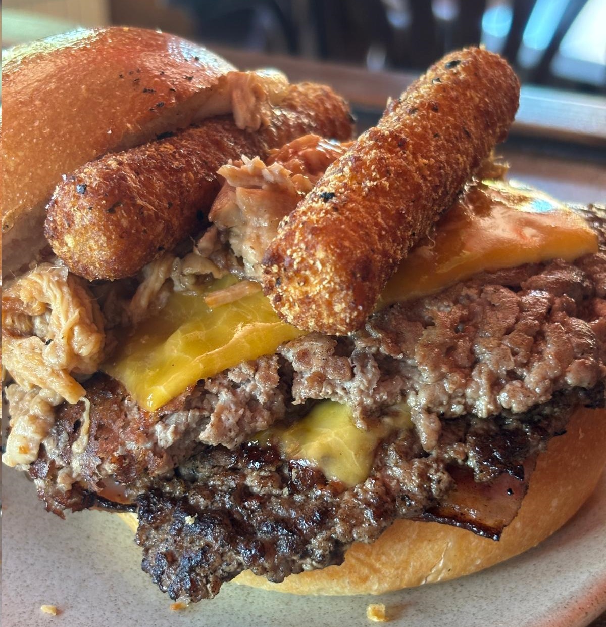 Doble disco de 90g carne de retinto, doble de cheddar madurado, bacón crujiente, cebolla caramelizada, costilla de cerdo a baja temperatura, 2 mozzarella stick y salsa especial del cheff.