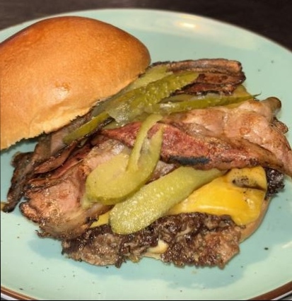 Doble disco de retinto de 90g, Doble de cheddar americano, Bacon crujiente, cebolla crujiente, pepinillos, cebolla en el smasheado y una salsa de la casa.