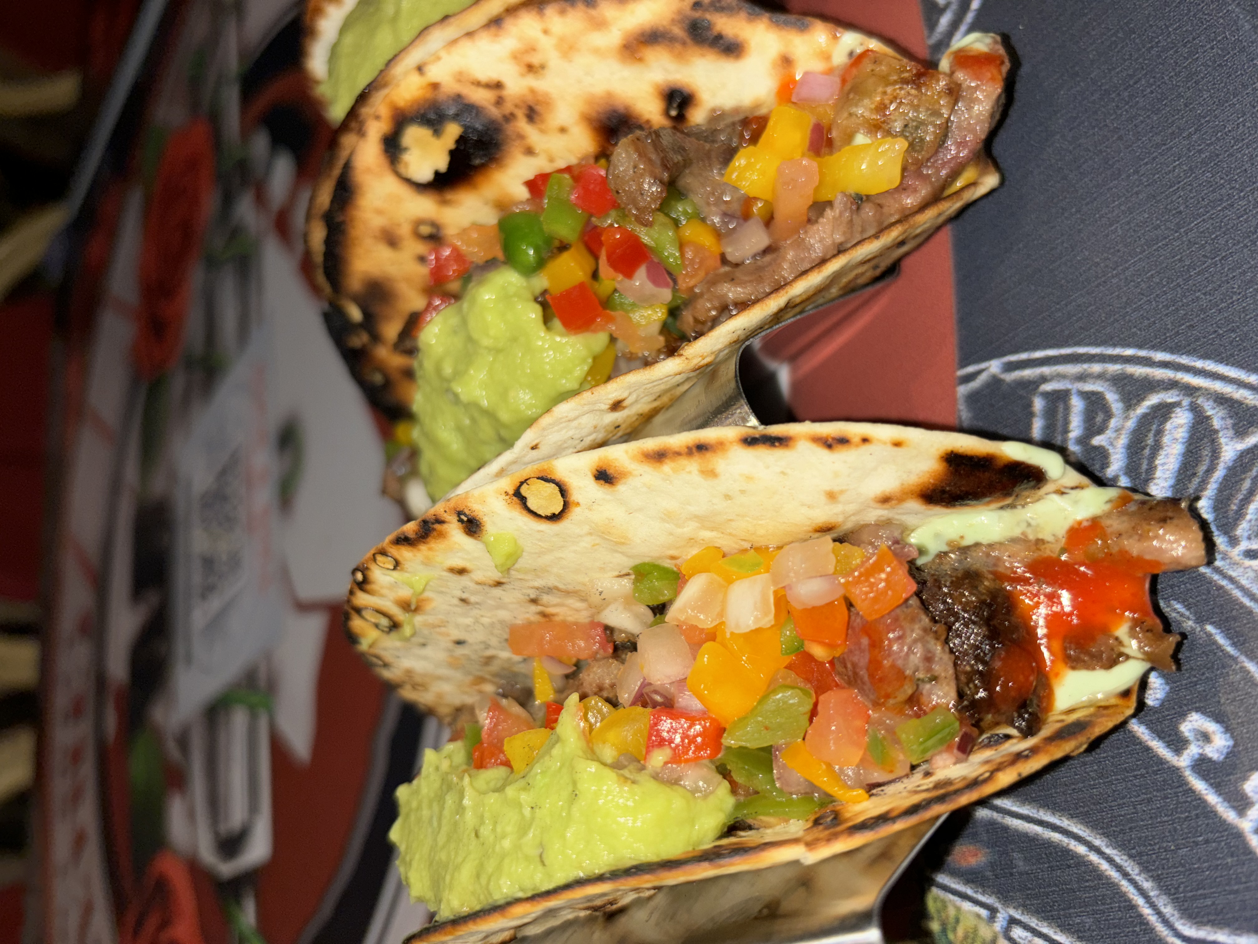 Carne de cerdo macerada, pico de gallo, Lima, mayonesa de pimientos chopotle, lima, cilantro y guacamole